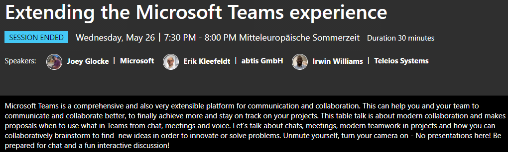 26.05.2021 | Microsoft Build 2021 | Online | Table Topic CON044 | Extending the Microsoft Teams experience | Microsoft 365, Productivity, AppDev | Level N/A | Co-Host
